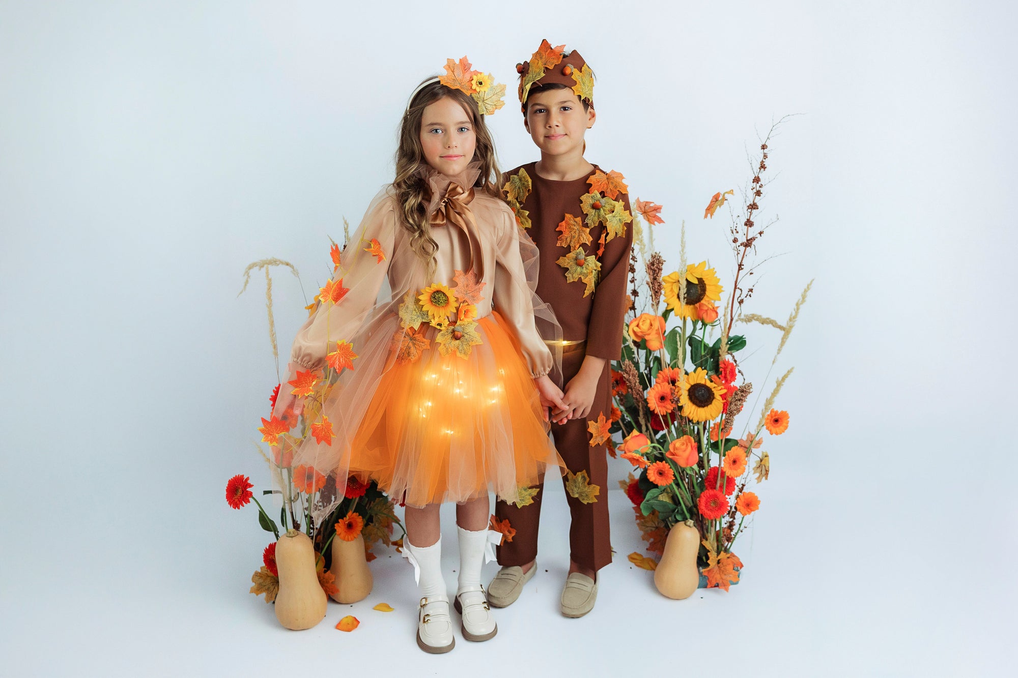 Costume de toamnă pentru serbările copiilor, cu luminițe și detalii magice. Zâna Toamnei, Regele Toamnei, dovlecei și pelerine decorate cu frunze. Realizate în România, livrare rapidă și comenzi de grup pentru grădinițe și școli. 🍂✨
