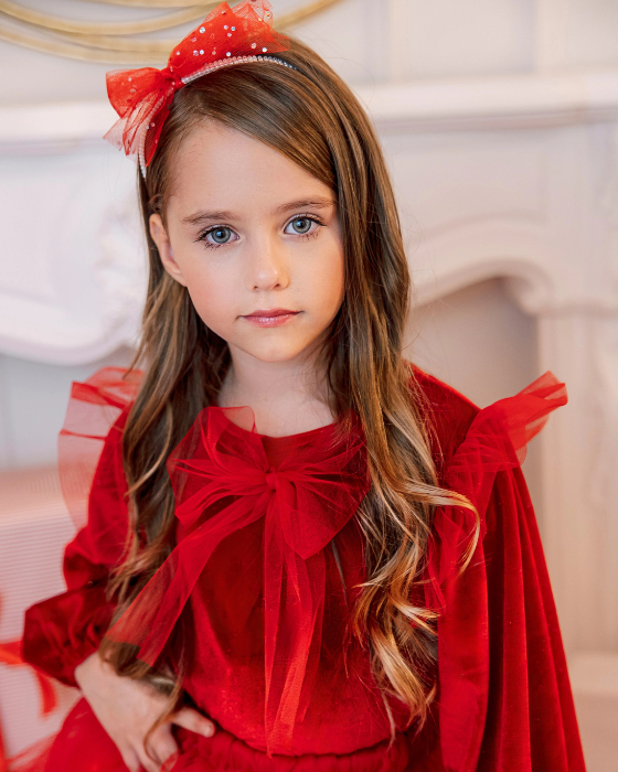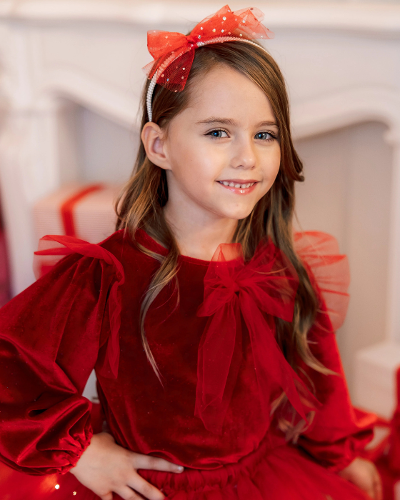 Această bluziță din catifea cu sclipici sau simpla aduce cu sine magia Crăciunului în fiecare cusătură. Cu nuanța sa vibrantă de roșu și sclipiri strălucitoare, este alegerea perfectă pentru fetițe în această perioadă specială a anului.