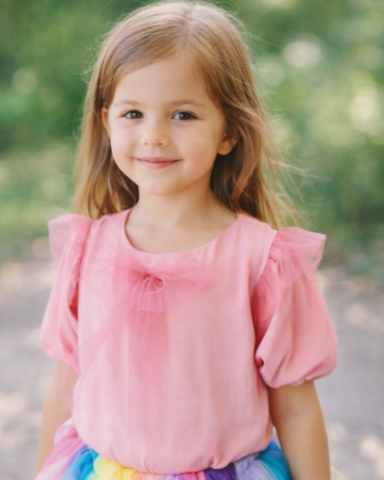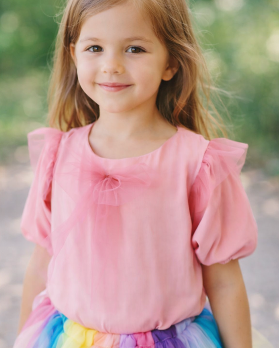 O bluziță de-a dreptul minunată, dintr-un material bumbăcos fin și perfect pentru pielea copiilor. Cu volănașe de tulle la umeri și o fundiță din tulle roz pe centrul bluziței. Mânecile bufante cu elastic lejer. Este bluziță perfecta pentru o zi de naștere, dar și pentru a o purta la grădiniță sau în parc. Poate fi adaptată în stiluri atât elegante, cât și sport.
