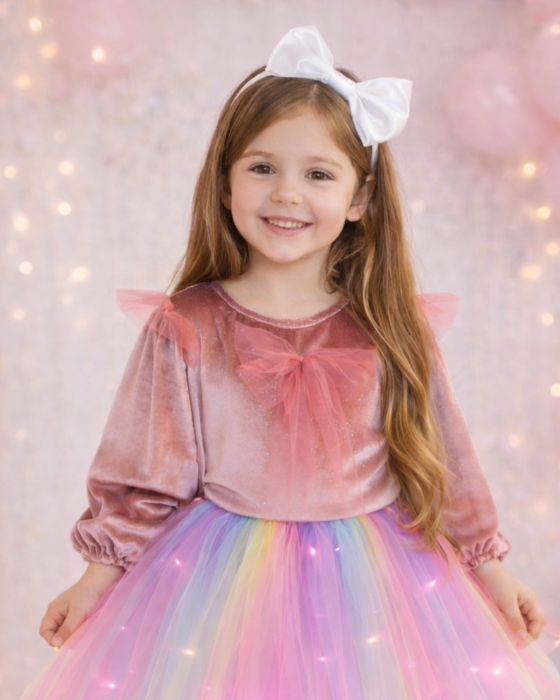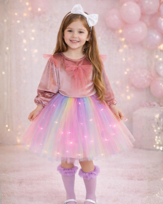 Fustita cu luminite curcubeu pastelat este confectionata din fasii delicate de tulle legate nod cu nod. Taliei elastice ii confera confort si flexibilitate pentru micuta dumneavoastra. Bentita de perle metalica cu luminite adauga o nota de eleganta si strălucire, transformand fiecare moment intr-o ocazie speciala. Perfecta pentru petreceri, evenimente sau jocuri pline de magie si culoare.
