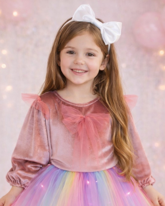 Compleul contine fustita cu luminite pastelata, bluzita catifea roz si bentita cu fundita alba.