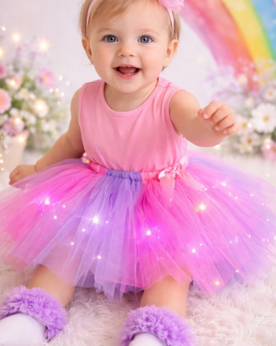 Fustița Unicorn Magic din tulle moale mov si roz bombon, căptușită, cu talia pe elastic.