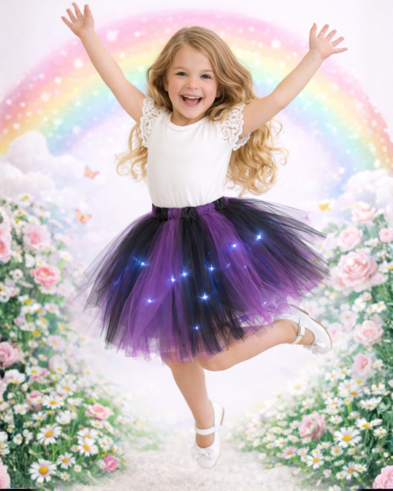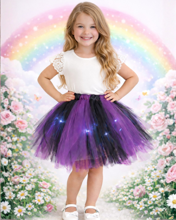 Fustița din tulle moale negru și mov, căptușită, cu talia pe elastic. Ajustare cu ajutorul unei panglici. Luminițe ușoare de tip LED pe baza de baterii.