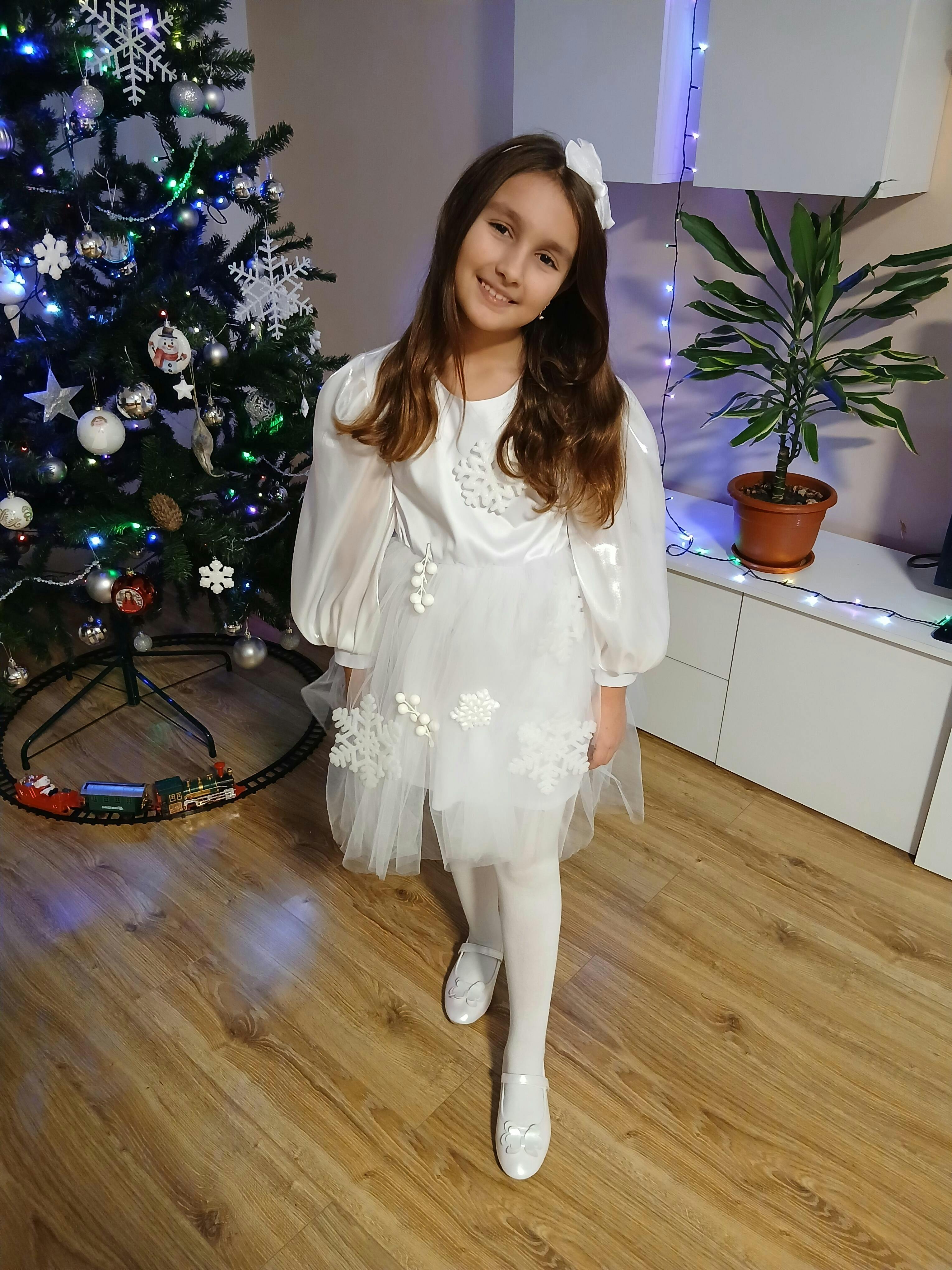 Croi stil tutu, din tafta albă și tulle alb. Elastic în talie, închidere cu nasture la spate, mânecă bufantă din organza cu manșetă. Se îmbracă ușor și se adaptează pe talia oricărei fetițe.