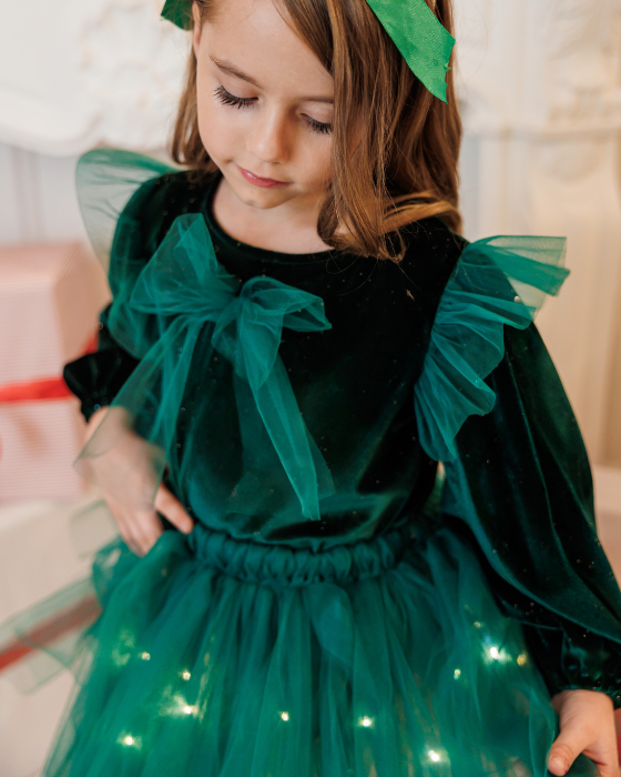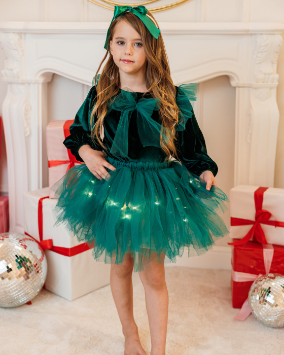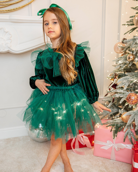 Compleul conține: Fustiță cu Luminițe, Bluziță Catifea Soft, Bentiță cu Perle si Fundiță.