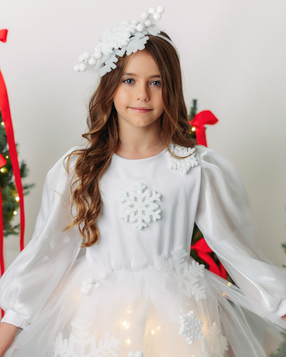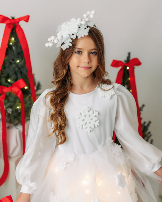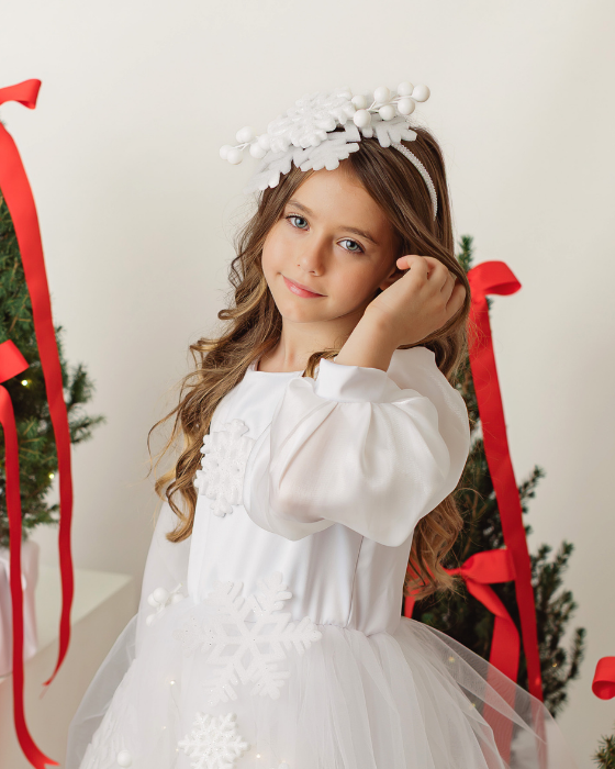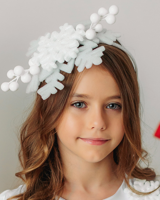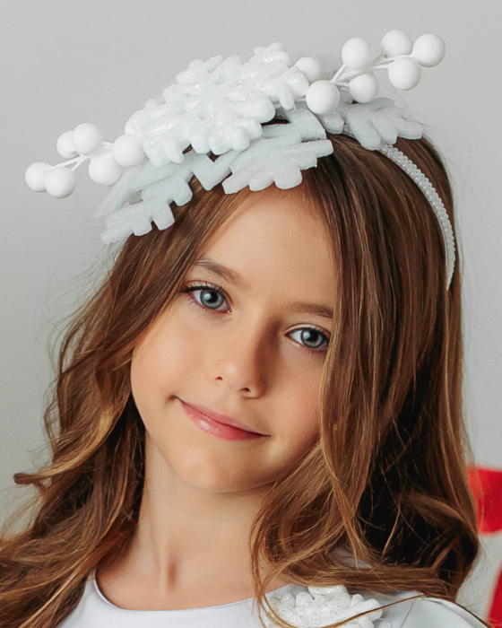 Bentița este din metal, accesorizată cu straturi de Fulgi mari si mici si cu crengute cu zapada. Este o bentita impresionanta de fulg de nea pentru minunatele serbari pe care copiii le au