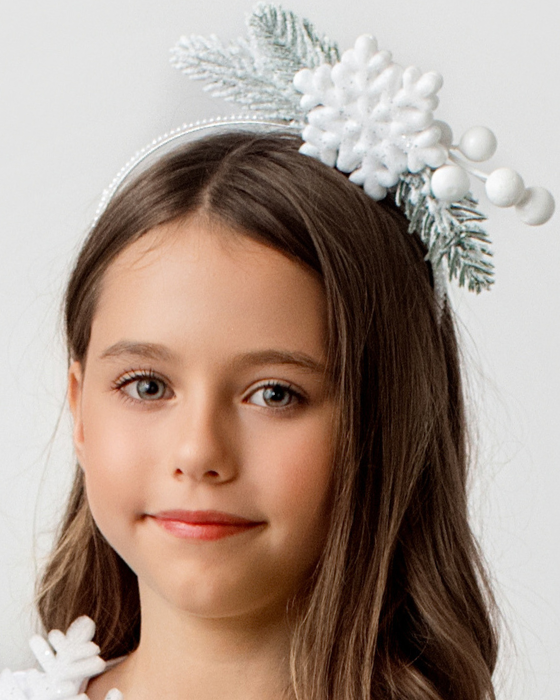 Bentița este din metal, accesorizată cu perle albe si crengute de brad ninse cu zapada, fulg de nea sclipicios si texturat si desigur, bilute albe atat de Craciunesti care imita zapada! O bentita perfecta pentru Serbarile de Iarna de la gradinita sau scoala din iarna aceasta