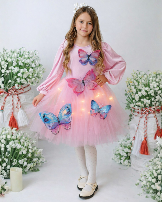 Croi stil tutu, din catifea roz și tulle roz. Elastic în talie, închidere cu nasture la spate, mânecă bufantă din catifea soft, cu manșetă. Se îmbracă ușor și se adaptează pe talia oricărei fetițe.